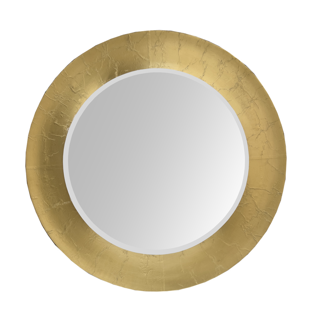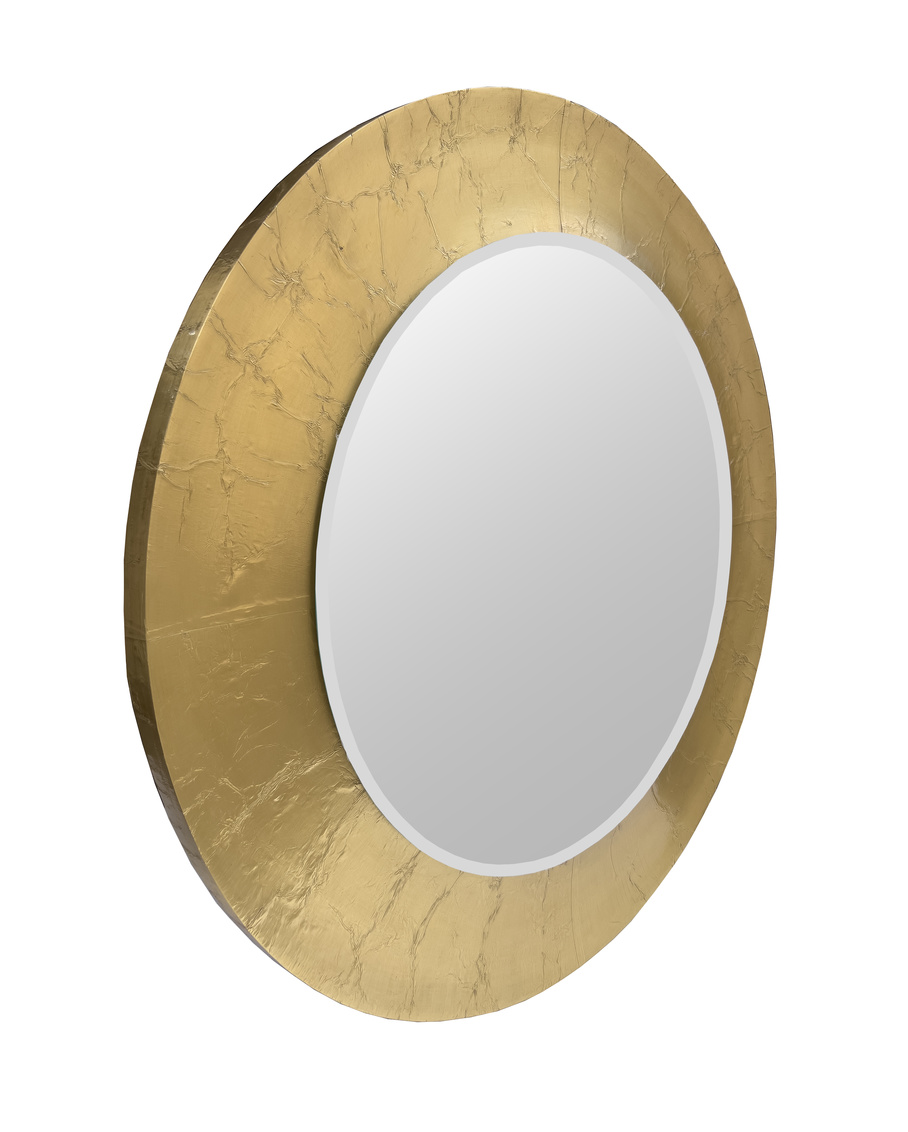 The beveled glass of the Reflection Mirror sits atop the round mirror frame of wrinkled brass in a slightly aged... Show more