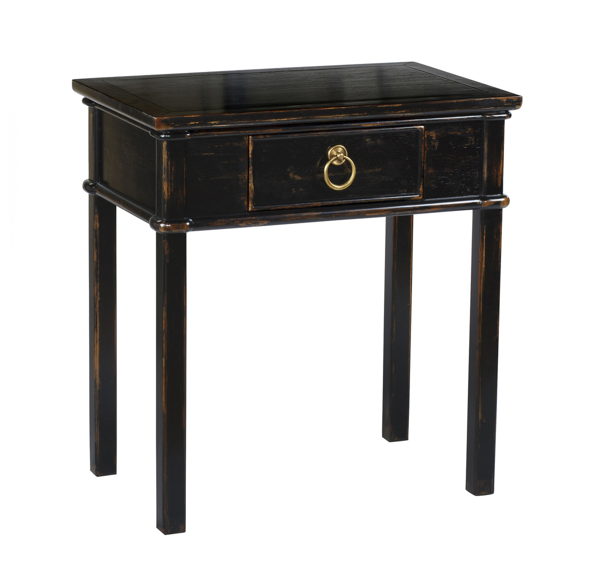 This Asian inspired end table is painted in a well-loved black finish revealing the warm underlying wood tones. A burnished... Show more