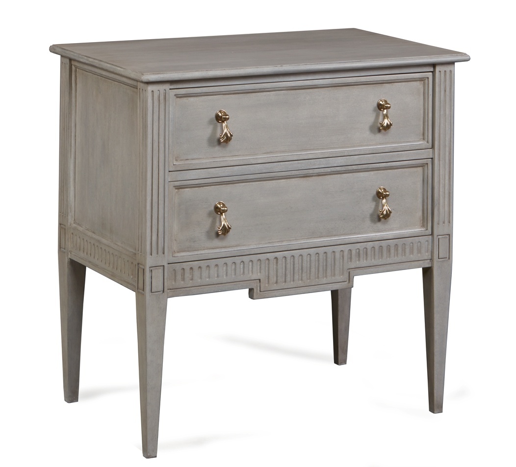 The two drawer Provencal Nightstand has traditional lines accented with fluted front legs and apron and accented by sculpted solid... Show more