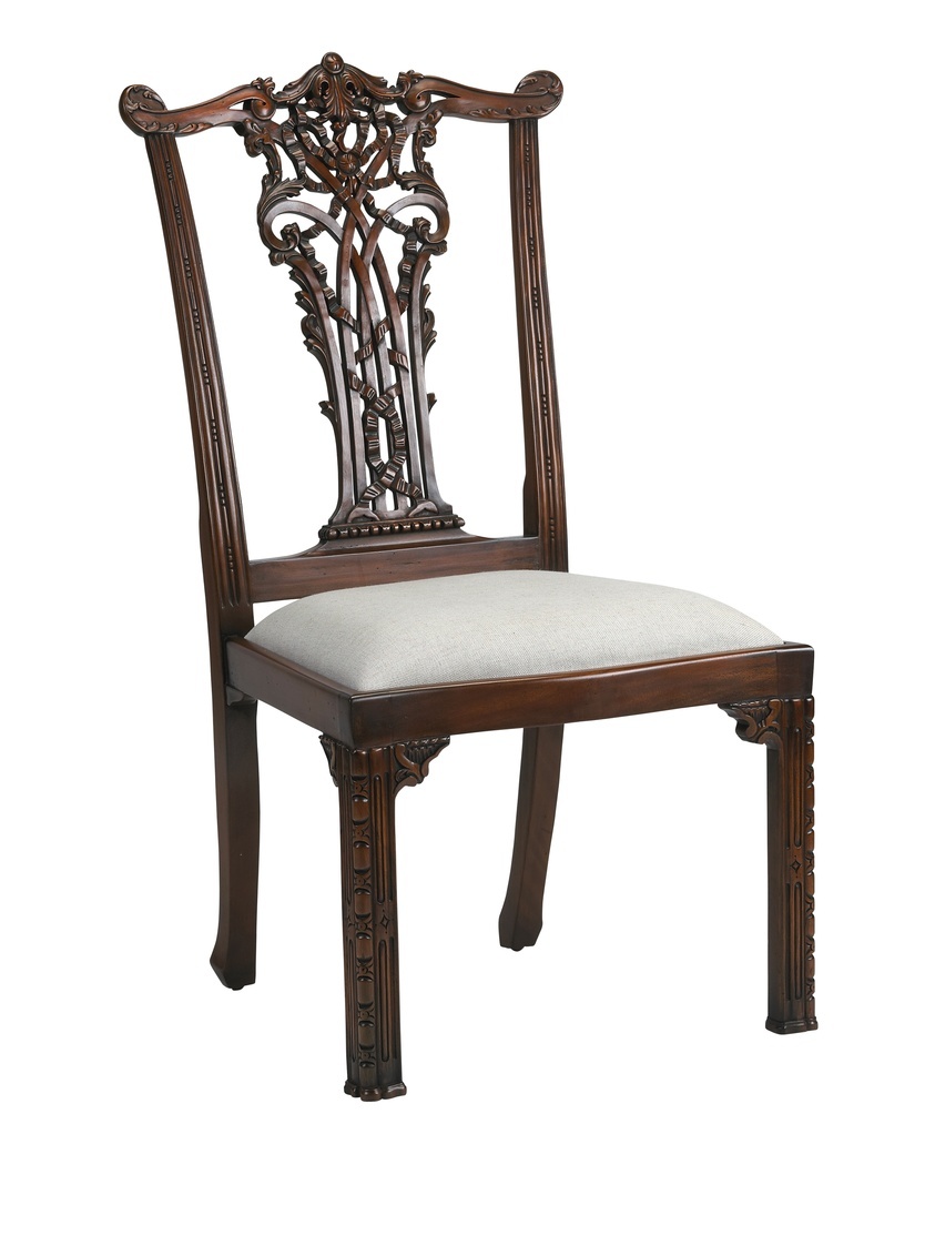 Detailed carving and beaded front legs are traditional touches of the Ribbon Back mahogany chair. Euro Linen fabric.